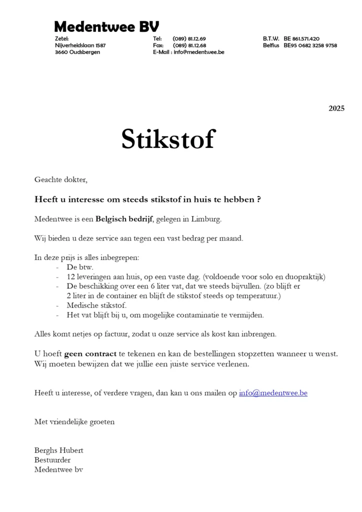 Onze oorsprong bevindt zich in het verhandelen van medisch stikstof aan artsen over heel Belgiƫ. Deze dienst is nog altijd de grootste focus van onze zaak en, indien u interesse heeft, kan u hier nog altijd gebruik van maken.
